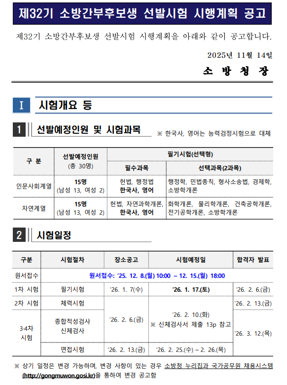 제32기 소방간부후보생 선발시험 시행계획이 발표되었습니다.