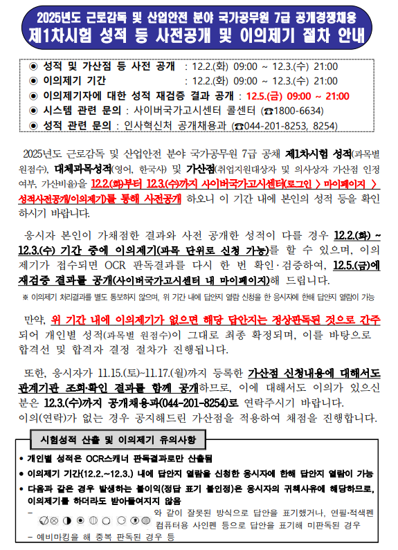 ◉ 성적관련 문의 : 인사혁신처 공개채용과 (☎044-201-8253, 8254)