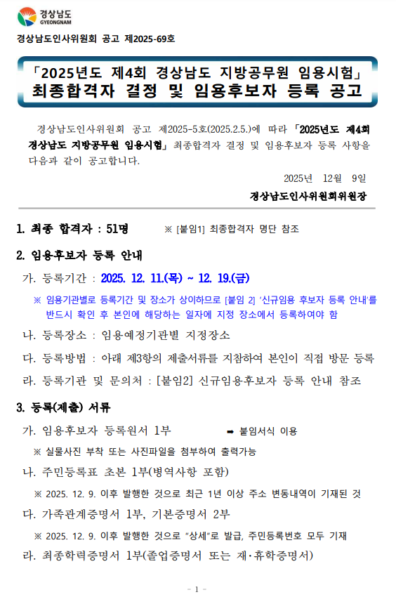 - [공고문]2025년도제4회경상남도지방공무원임용시험최종합격자결정및임용후보자등록공고.pdf 0.124MB