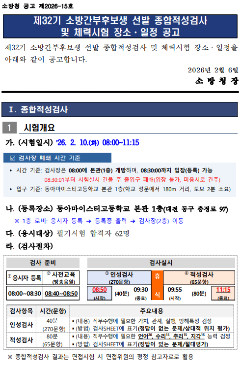 2026년 제32기 소방간부후보생 선발 종합적성검사및 체력시험 장소ᆞ일정이 발표되었습니다.