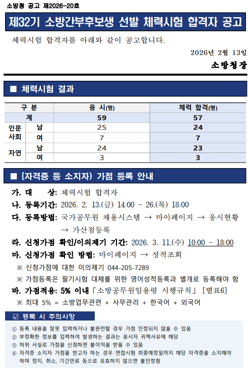 2026년 제32기 소방간부후보생 선발 체력시험 합격자 공고가 발표되었습니다.