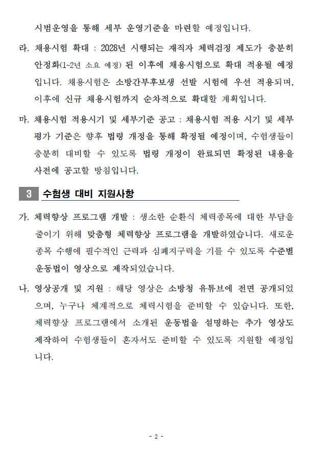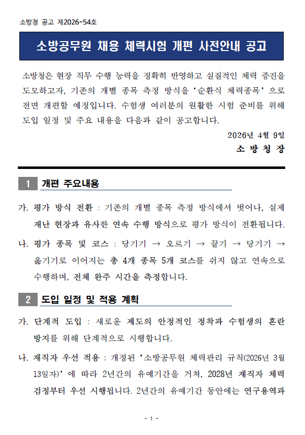 소방공무원 채용 체력시험 개편 관련 사전 안내가 공고되었습니다.